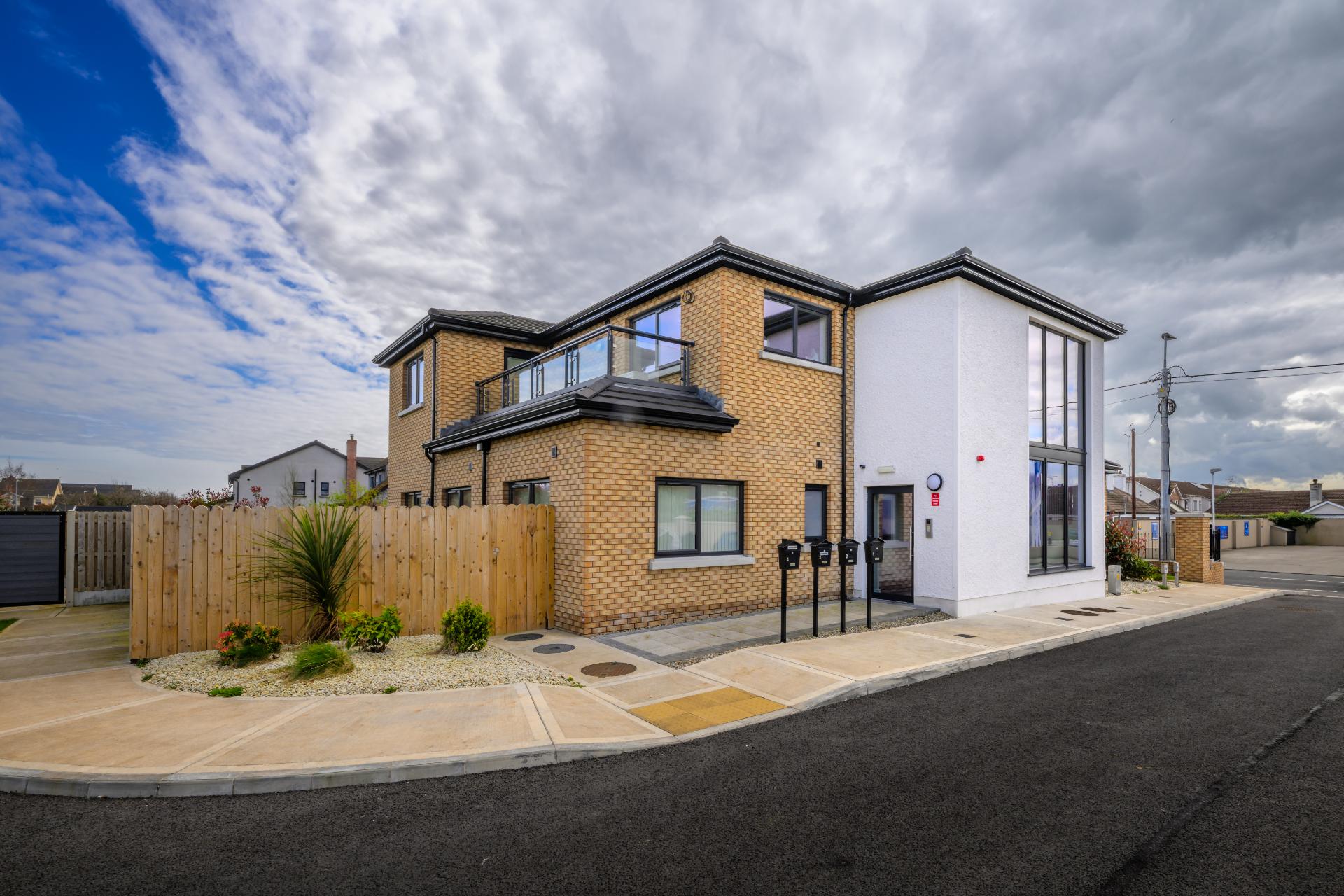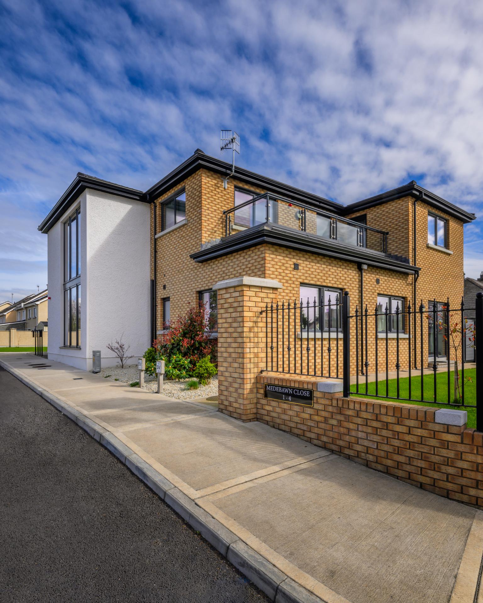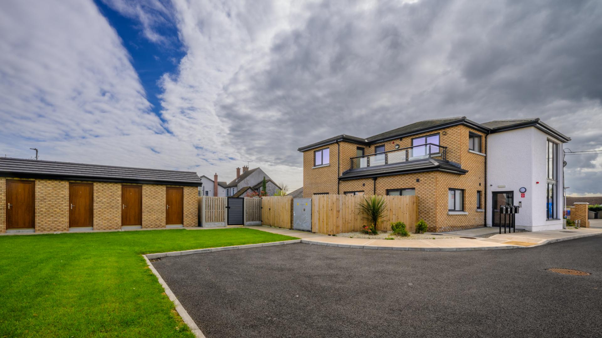 Delivered for Louth County Council, this scheme provided a two-storey block of 4 one-bedroom apartments with additional storage outbuildings. Finished with a mix of brick and render, the apartments feature roof terraces and energy-efficient air source heat pumps. The development included a new entrance from a busy road, with brick piers, low walls, and metal railings framing the site.