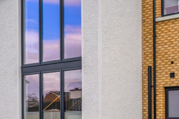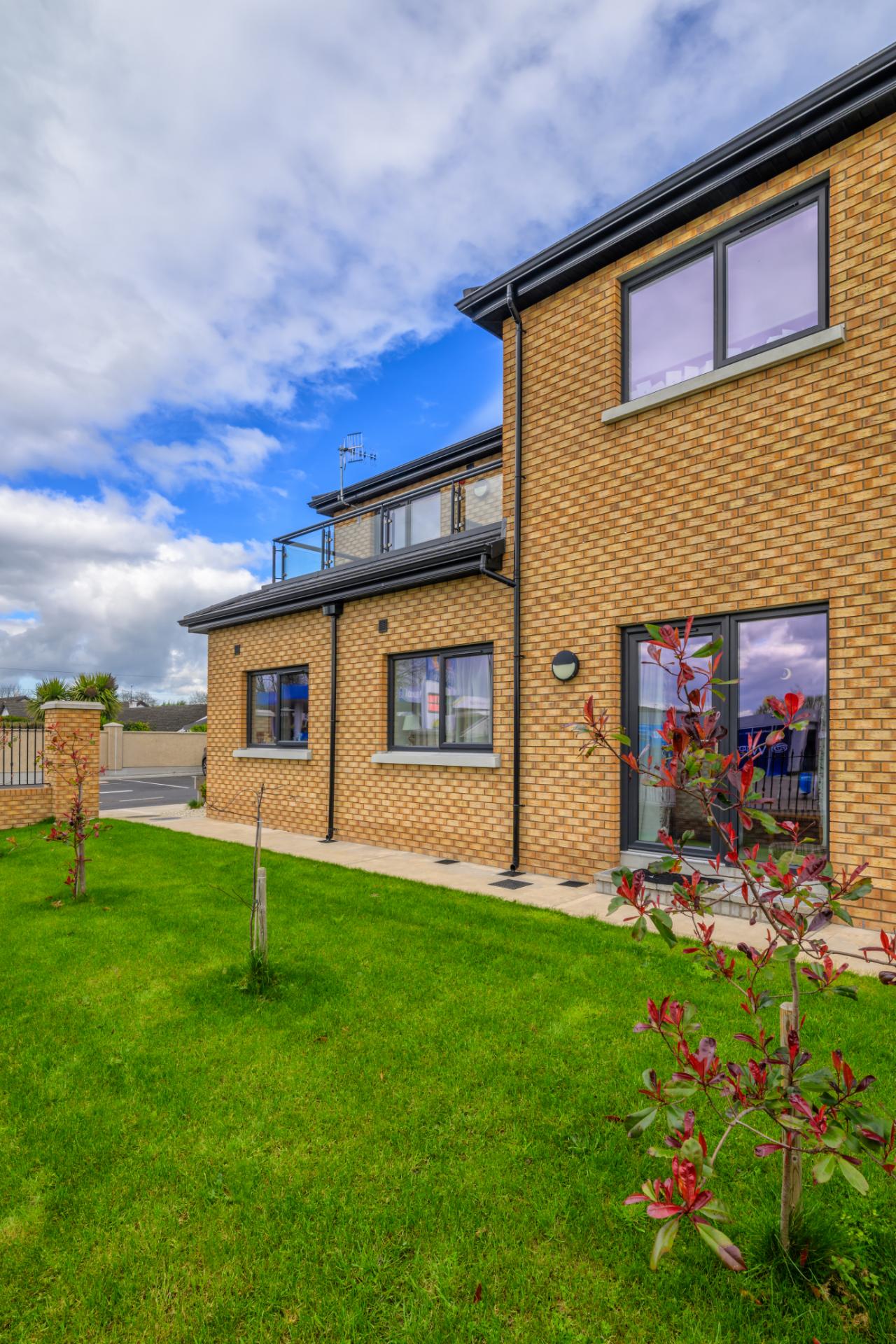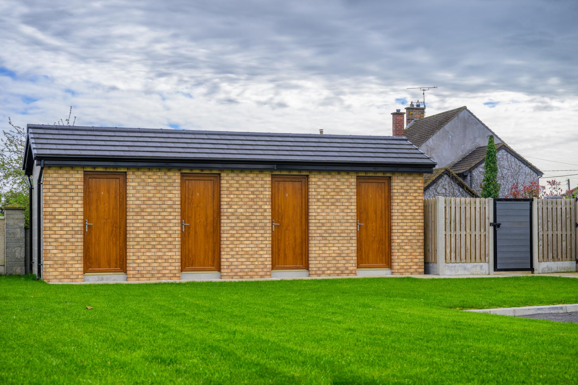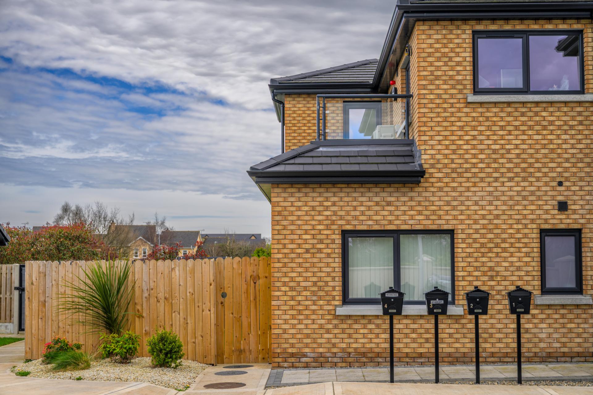 Delivered for Louth County Council, this scheme provided a two-storey block of 4 one-bedroom apartments with additional storage outbuildings. Finished with a mix of brick and render, the apartments feature roof terraces and energy-efficient air source heat pumps. The development included a new entrance from a busy road, with brick piers, low walls, and metal railings framing the site.